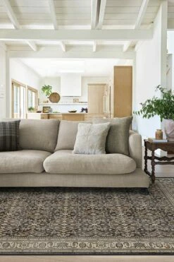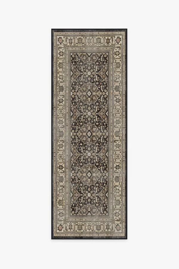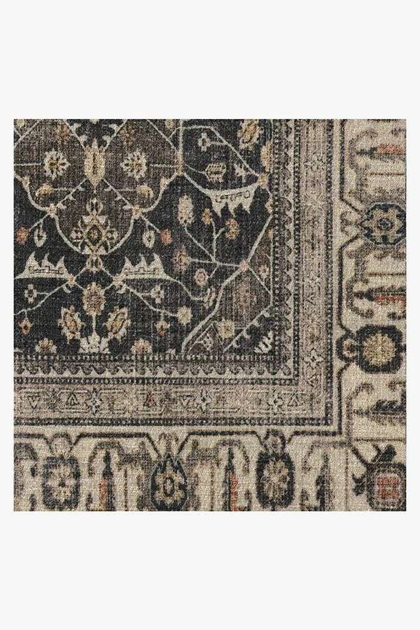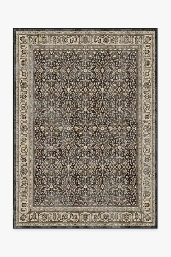 A vintage rug with an opulent floral design. Rich espresso and walnut browns mix beautifully with hints of gold and coral in this trellis-style rug, creating depth, while its highly stylized border. makes it look like a cherished heirloom piece. Water-resistant, stain-resistant, and machine-washable.