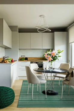 Bring a tropical vibe into your home with our Coastal Linear Stripe Aqua Rug. This green striped rug features a fine-lined pattern that captures the deep teal blue color of the Pacific Ocean, along with a sea-inspired spectrum of turquoise, taupe, fog, dark rose-gold, and terracotta. Easily incorporate this accent piece into your coastal, contemporary, or modern style furnishings.