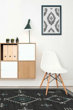 By playing with texture and a pared-down color palette, our Damali Charcoal Rug pays homage to traditional design. A trio of diamonds, tinted in white on charcoal with pops of teal blue, serve as the centerpiece of this rug, surrounded by subtle linework for that modern, minimalistic appeal.