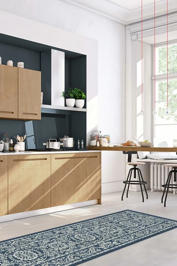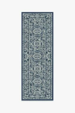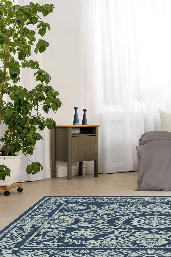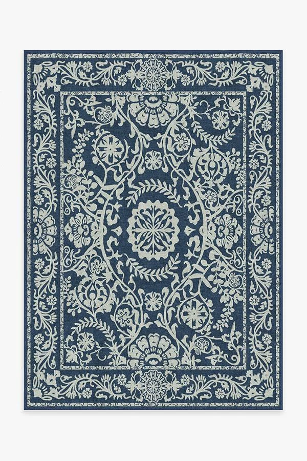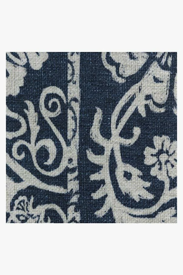 Delphina Navy Blue Rug takes its design cues from the art of woodblock printing. Featuring intricate floral and vine details, this navy blue rug plays up a classic style in a modern colorway.