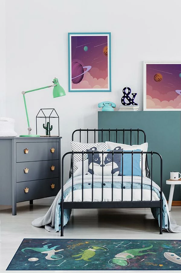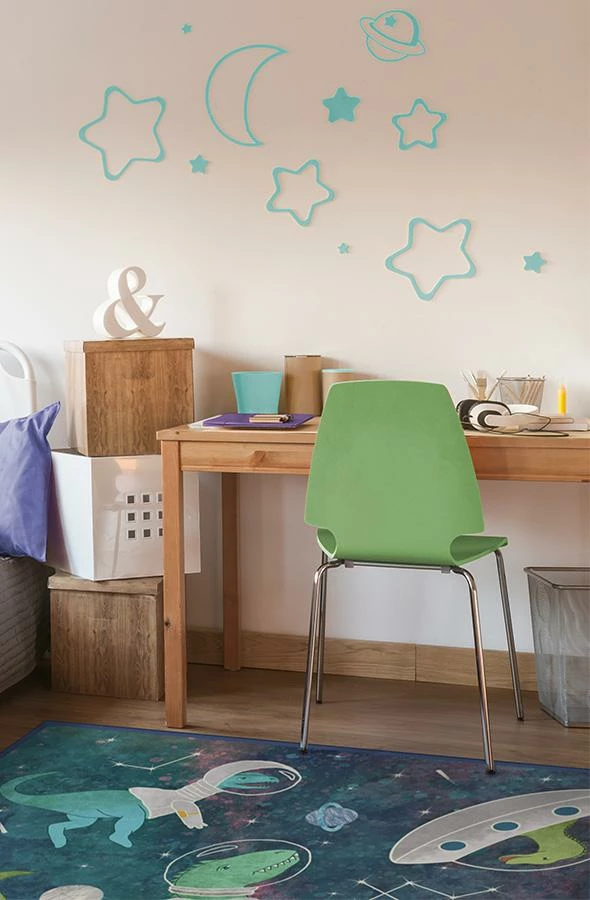 Dinosaurs have taken to the stars in our Dinosaurs in Space Rug. Whimsically drawn dinos in spacesuits float upon a galaxy of planets, shooting stars, the moon, and constellations. Rendered in textured tones of leaf green, turquoise, navy blue, and neutral grey, this kids’ room rug will surely delight your little astronaut or science buff.