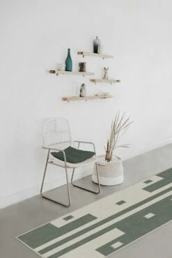 Domo Sage Rug was designed to mimic the facade of pueblo-style homes in the Southwest. Geometric patterns and color blocking create this mirror-image design, tinted in soft hues of sage and cream.