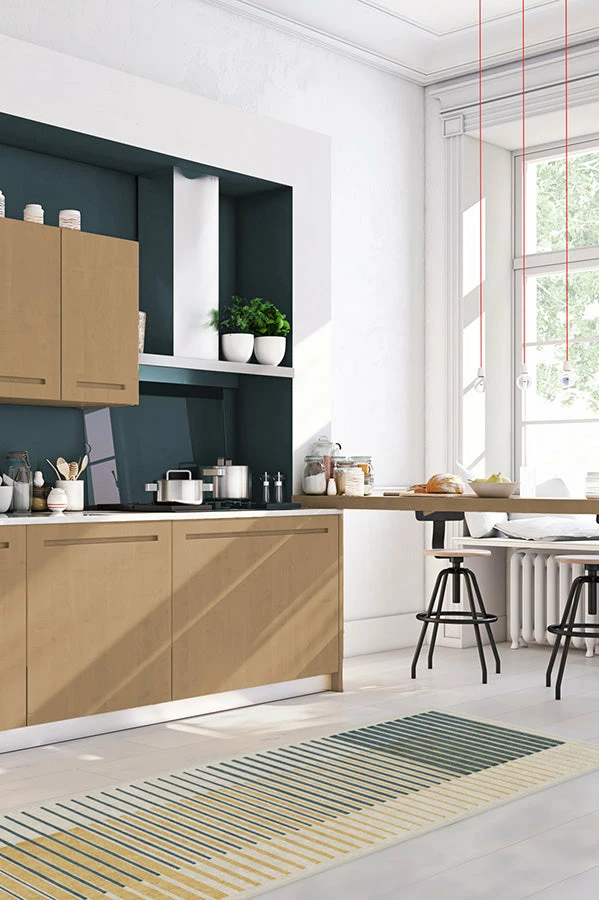 This Gradasi Teal Quartz Rug is a great way to infuse a unique pattern and color into your home. Featuring overlapping teal grey and coriander lines, drawn in various weights to mimic an ombre effect, this abstract art-inspired rug perfectly complements a modern minimalistic space.