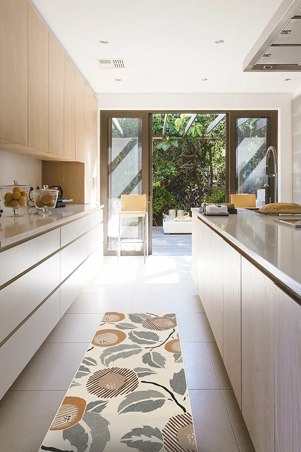 Add some vintage flair to your home. Inspired by Yumeji Takehisa, this Hana Tiger Orange and Grey Rug displays a modern-retro floral motif in hues of dark and light orange and grey with accents of red.