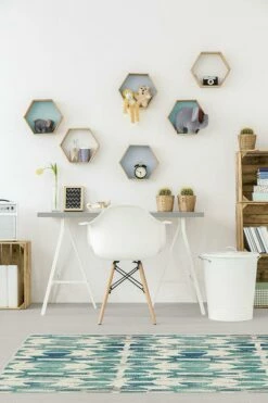 Our Hesperia Teal Rug features a blue-teal color palette that accentuates its chevron motif.