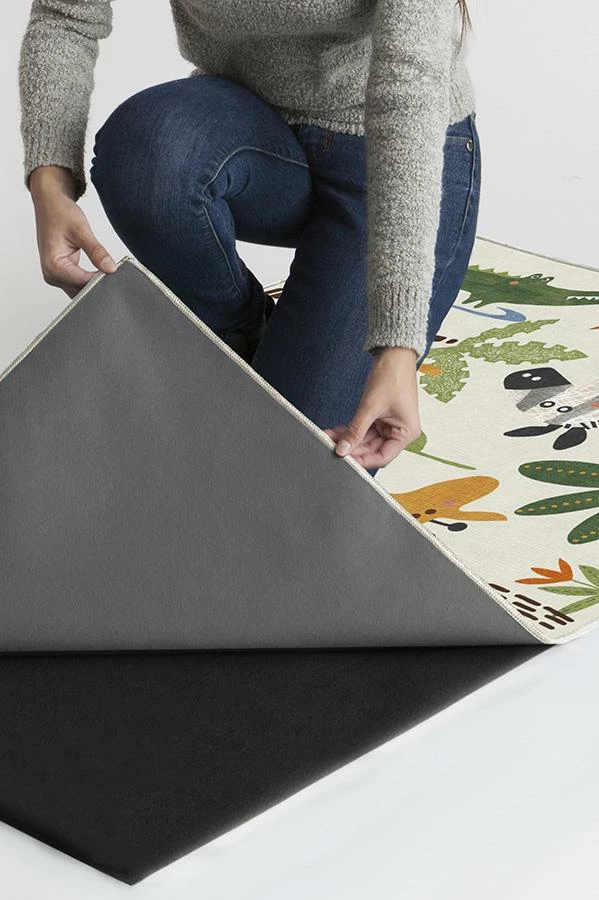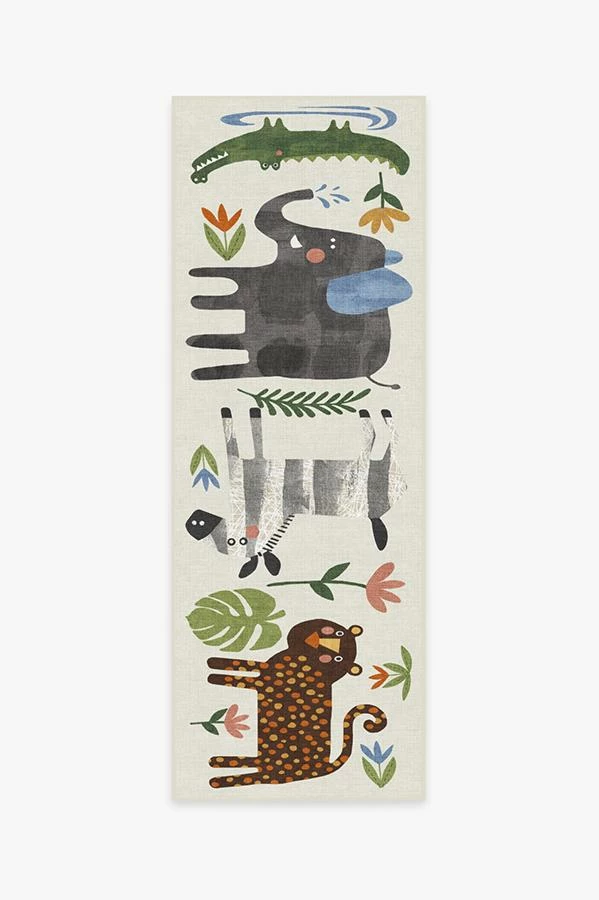 Little explorers will love this crew of critters on our Jungle Safari Multicolor Rug. Tinted in watercolor hues of blue, green, and yellow, this rug features cheerful animals ๏ฟฝ๏ฟฝ๏ฟฝ lion, zebra, giraffe, elephant, and crocodile ๏ฟฝ๏ฟฝ๏ฟฝ roaming among rubber trees, leaves, and flowers, adding a wildly whimsical touch to any child’s space.