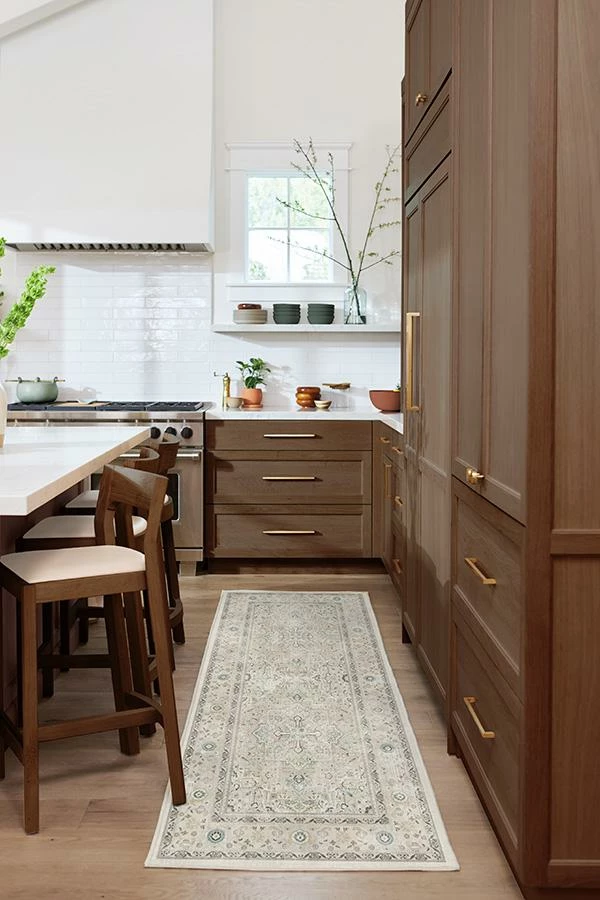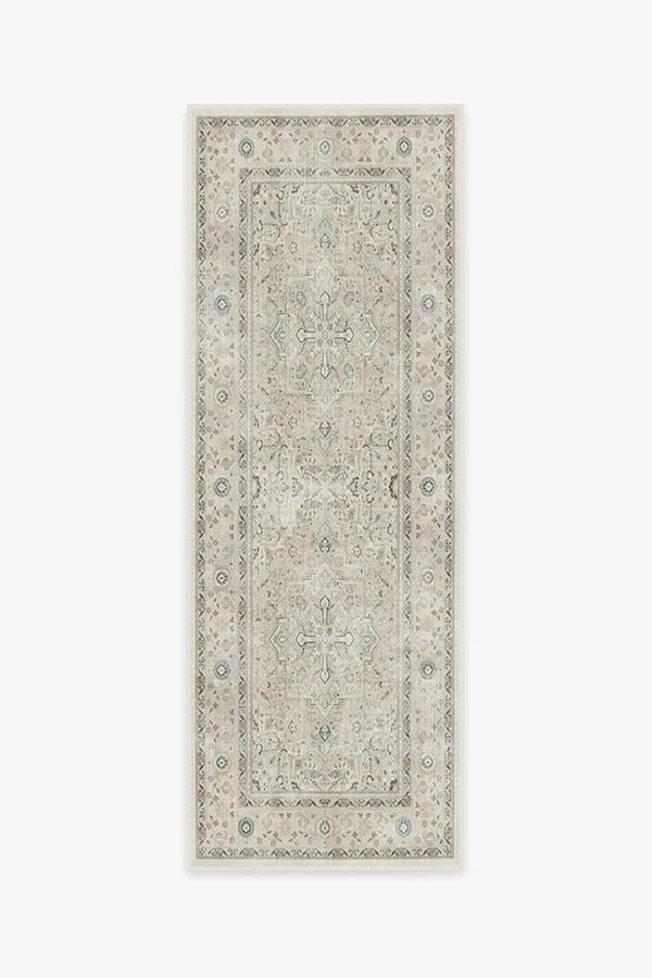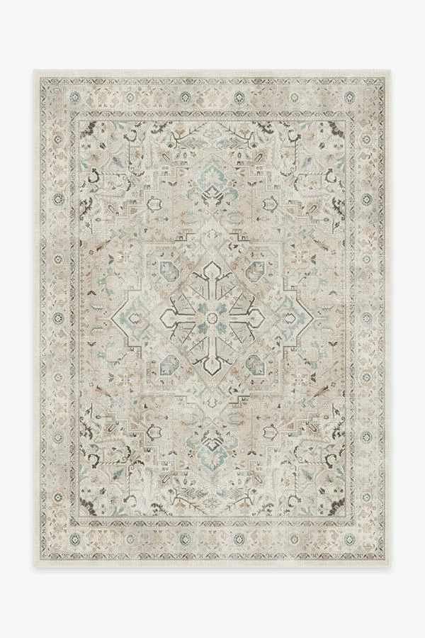 A minimalist take on a classic Persian design. Our Kamran Ivory Opal Rug features a large medallion and ornate border inspired by traditional Heriz rugs, but in an updated neutral color palette. Shades of ivory are accented with dark brown and hints of light blue and coral. Made from our water-resistant, stain-resistant, and machine-washable low-pile Chenille material.
