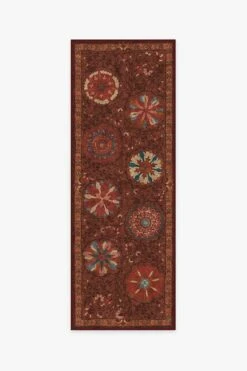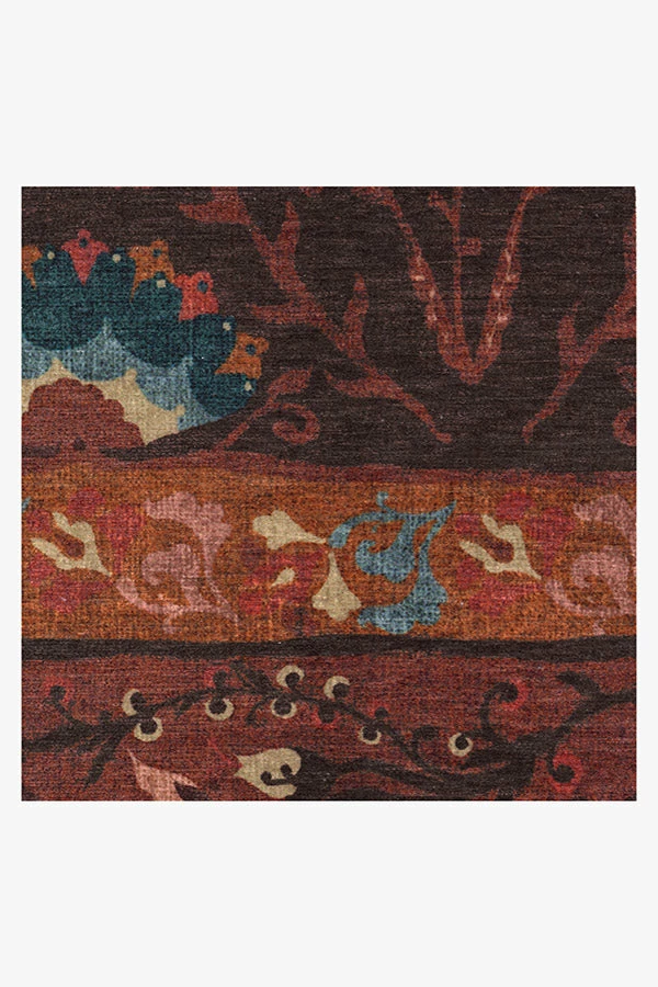 Greet the changing of seasons with our Latiff Autumn Rug. This Persian rug-inspired motif features a band of floral medallions surrounding a field of fanned florets. Tinted in brick red, summer orange, sea blue, and bittersweet chocolate, this accent rug will complement any contemporary, classic, or eclectic-style interior.