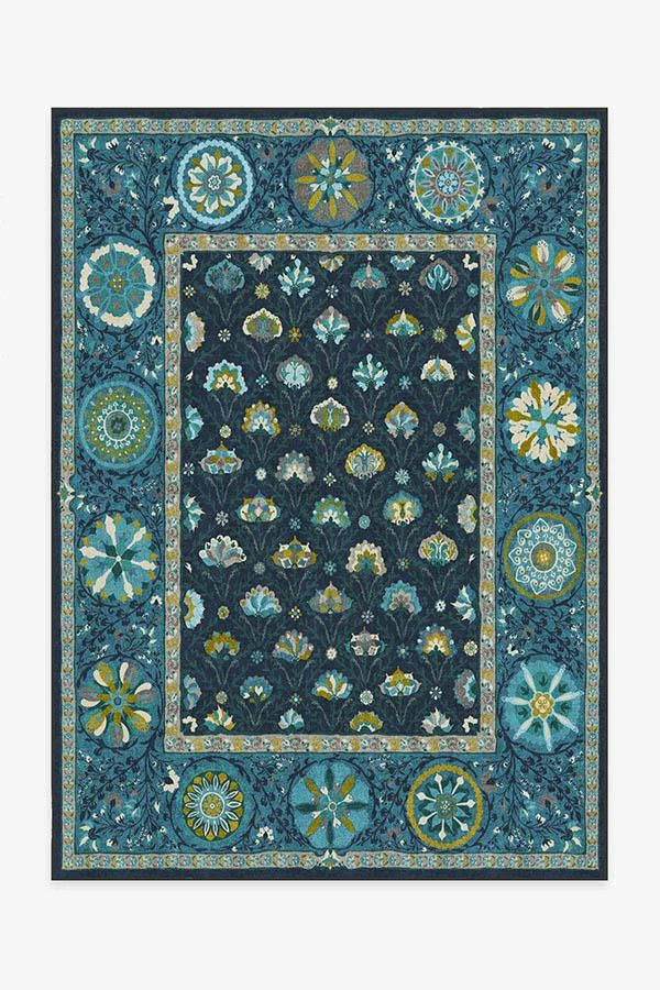 Add finesse to your home decor with our stunning Latiff Midnight Blue Rug. Gorgeous hues of deep teal blue, goldenrod, dove grey, and navy black blend together to create a meticulous field of fanned florets, surrounded by an assortment of floral medallions. A nod to classic Persian rug designs, this striking accent rug will instantly elevate your contemporary, classic, or eclectic interior.