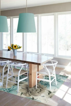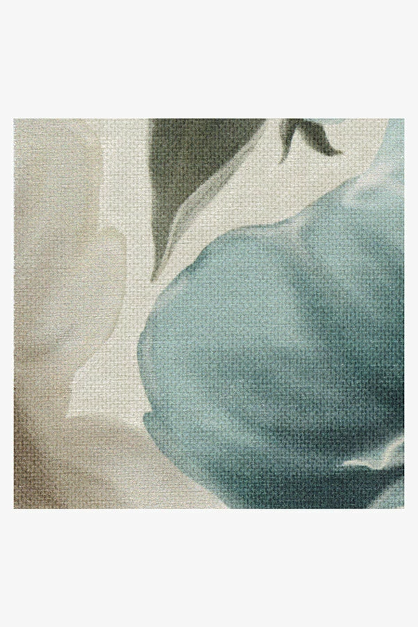 Fill your home with beautiful peonies with our Peony Jade Rug. This rug features delicate, large-scale blue and grey peonies, blooming around sage green leaves on a light cream background.