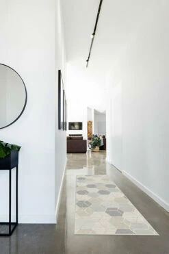The Prisma Natural patterns an overlapping hexagonal motif with accents of sand and grey.