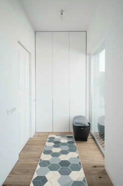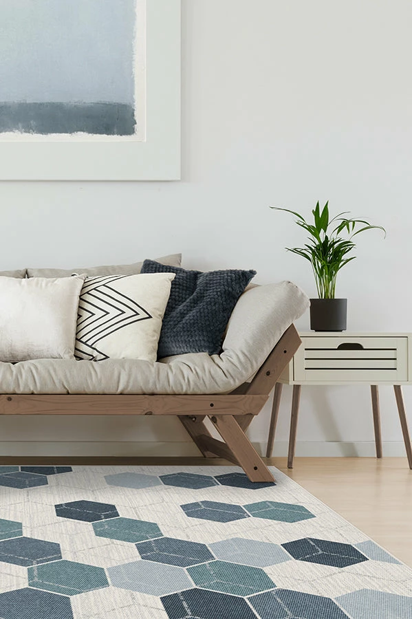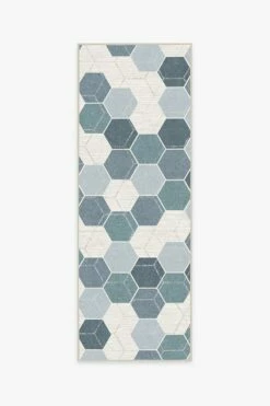 The Prisma Slate blue and cream rug layers hexagonal shapes in shades of light blue, teal, and cream. The abstract honeycomb design of this blue geometric rug will bring a modern edge to your decor.