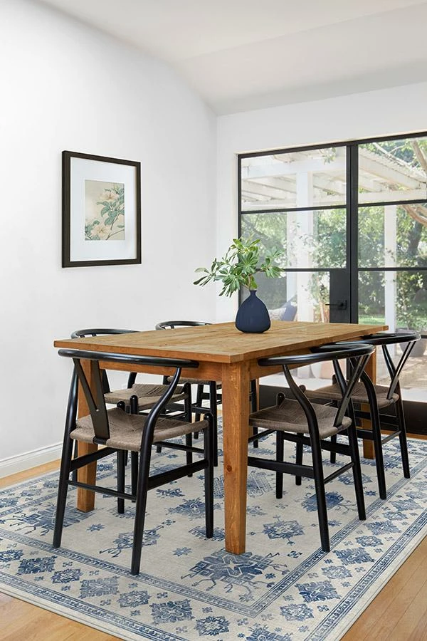 A Persian-inspired pattern gets a fresh color palette. A repeated geometric motif with clean negative space in a striking palette of blue and off-white make this rug reminiscent of delft pottery. Water-resistant, stain-resistant, and machine-washable.