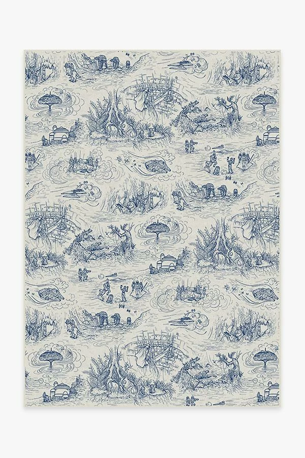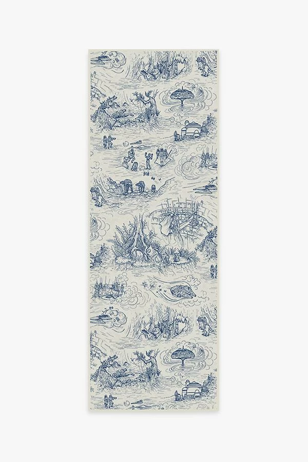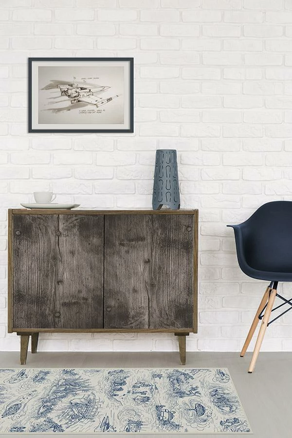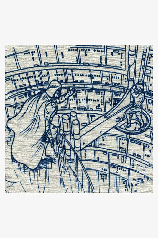 Delight any Star Wars fan with this Star Wars Toile Blue Rug. Featuring a design inspired by toile, a printed French fabric that gained popularity in the late 18th century, this rug captivates with its retelling of the iconic scenes from The Empire Strikes Back. From Yoda training Luke Skywalker on Dagobah to Darth Vader’s iconic “I am your father” scene, each section was meticulously hand-drawn in denim blue on a background of pearl.
