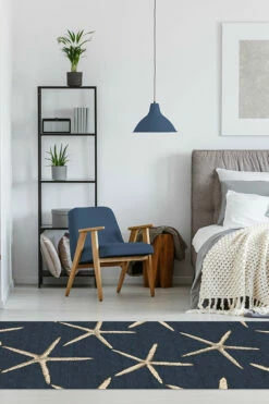 Accentuate the style of your home’s interior with our Starfish Navy rug. Its stunning sea-inspired design features a galaxy of taupe sea stars floating in an ocean of navy and light slate blue colors. This stunning floor decor piece is the perfect accent to bring nautical charm to your coastal, contemporary or modern home’s interior design.