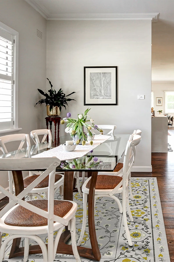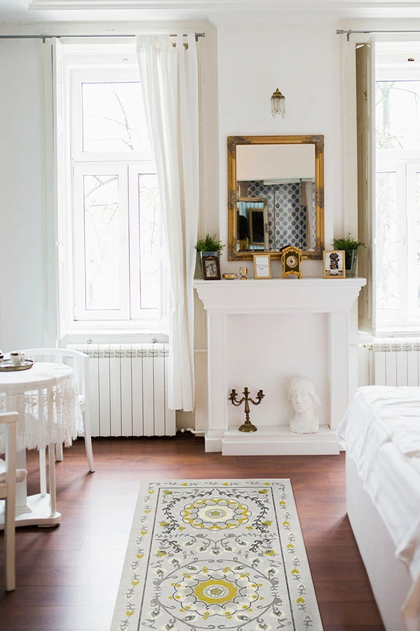 Bring show-stopping elegance to your home’s interior with our Suzani Yellow Rug. Its bordered and floral motif features an intricate display of blooms and vines in dazzling hues of yellow, gold, sage green, and silver grey. Let this opulent yellow boho rug raise the decorative bar in your country cottage or traditional home.