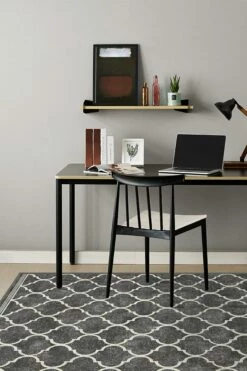 The Terali Black Rug looks to Moroccan rugs for inspiration, featuring a trellis design in neutral grey and gunmetal against a pearl background.
