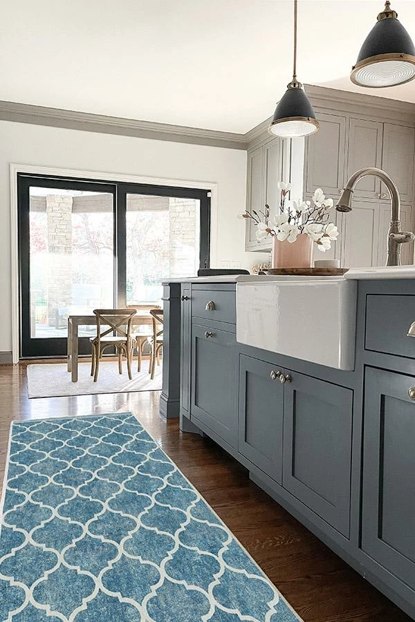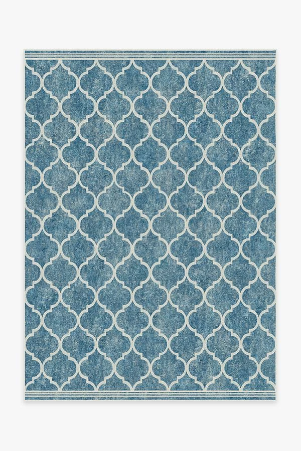 A contemporary pattern in a refreshing color. This rug, inspired by Moroccan rug designs, features an off-white trellis pattern on a textured ocean blue backdrop. Water-resistant, stain-resistant, and machine washable.
