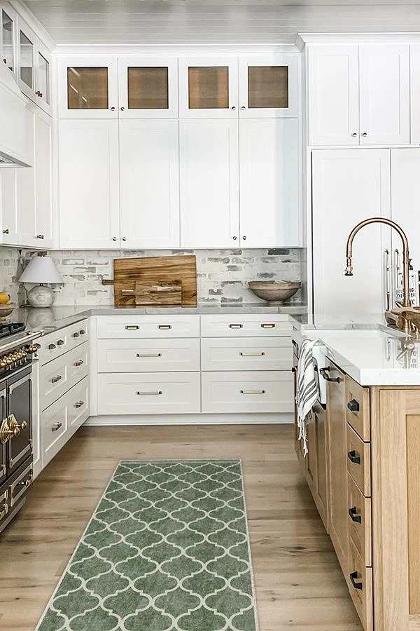 A classic pattern in a striking color. Taking inspiration from Moroccan rug designs, this geometric rug features a classic trellis pattern in off white on a textured ivy green backdrop. Water-resistant, stain-resistant, and machine washable.