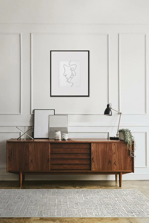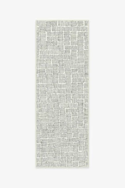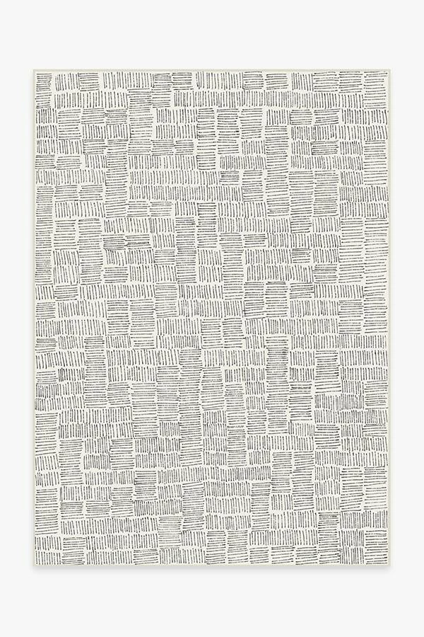 Our Thalia Black Rug features various squares of hand-drawn hatchwork design in neutral grey on cream.