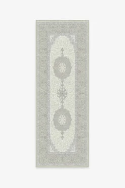 The Tisa French Grey brings a blended neutral palette to a traditional floral inlay motif with a prominent central medallion.