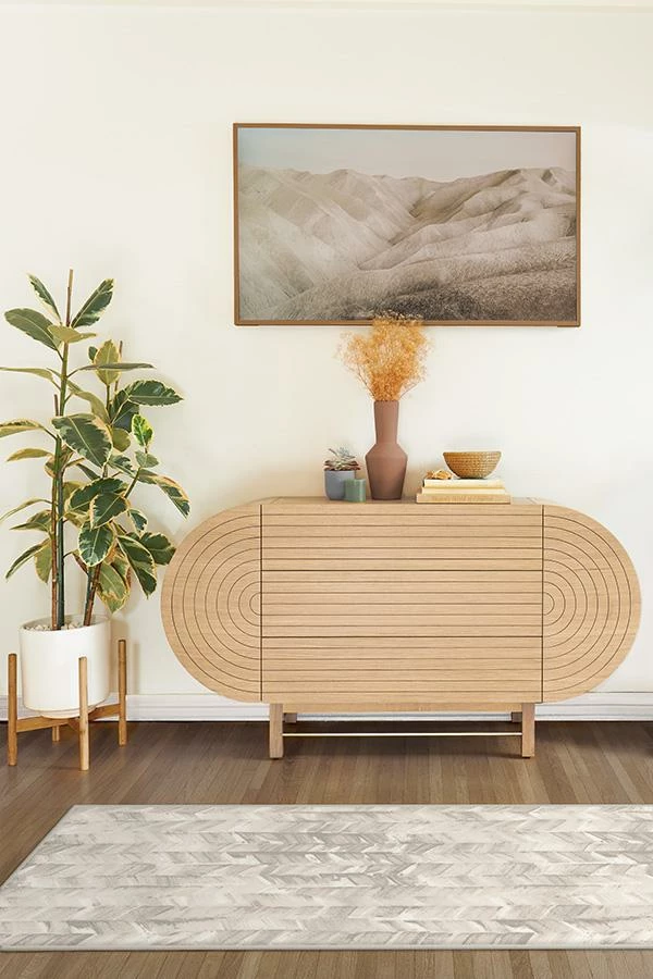 The Watercolor Herringbone Cream rug uses a layered brushstroke effect in varying hues of neutral tans and whites.